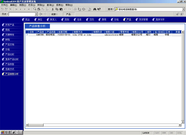 管理人員可能需要對(duì)比產(chǎn)品銷售計(jì)劃與實(shí)際銷售的產(chǎn)品數(shù)量的關(guān)系,也有可能要對(duì)比某款產(chǎn)品與競(jìng)爭(zhēng)產(chǎn)品銷售的情況,這時(shí)候可以利用產(chǎn)品銷售統(tǒng)計(jì)功能。它最大的好處是各項(xiàng)目數(shù)據(jù)普遍關(guān)聯(lián),允許任意組合查詢條件(見(jiàn)圖4,點(diǎn)擊下圖,可彈出更清晰的大圖)