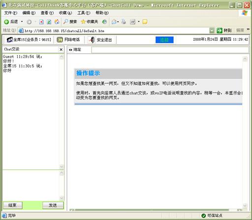 網(wǎng)頁同步:客戶在通過"客服代表回復(fù)"、"互聯(lián)網(wǎng)電話"、"文字交談"等方式與客服代表進(jìn)行實(shí)時(shí)交流時(shí),還可以通過網(wǎng)頁同步功能,與客戶代表的瀏覽器進(jìn)行同步。這樣,客戶與客戶代表看到的是同一網(wǎng)頁,由客戶代表引導(dǎo)客戶對(duì)網(wǎng)頁進(jìn)行瀏覽,找到所需要的信息。網(wǎng)頁同步功能適用于不同的實(shí)時(shí)交流方式,可以大大提高客戶服務(wù)的效率和質(zhì)量。如圖14、15所示: