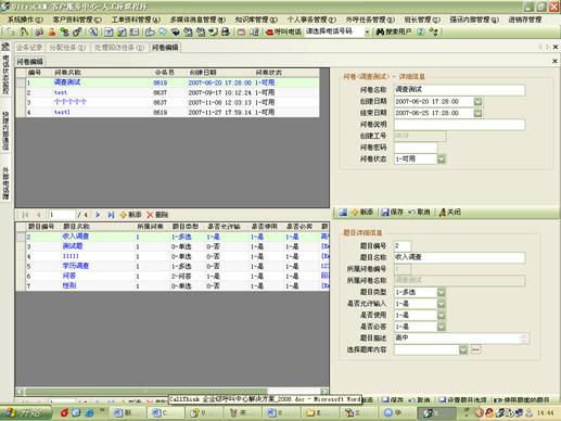 外呼中還可以建立問卷調(diào)查任務(wù)。同時(shí)還提供題庫管理、問卷編輯等功能,并且題目之間還可以設(shè)計(jì)流轉(zhuǎn)順序。方便使用者靈活設(shè)定問卷內(nèi)容。如圖20、21所示: