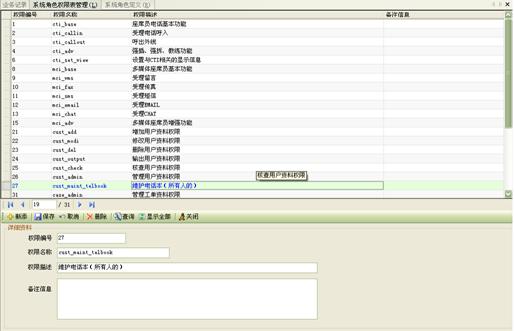 系統(tǒng)設(shè)置了多種對(duì)crm系統(tǒng)操作的權(quán)限,如圖27所示。這些權(quán)限方便管理人員根據(jù)坐席的不同情況,工作的內(nèi)容來自由組合這些權(quán)限。