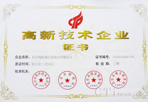CTI論壇(ctiforum)3月23日消息(記者 浩宇):商路通再傳喜訊,2012年3月12日商路通獲得了“國家級高新技術企業(yè)”證書,(證書編號:GR201111001184,有效期三年),這標志著商路通發(fā)展的又一個新的里程碑。
