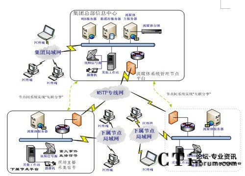 2、集團(tuán)與各下屬節(jié)點(diǎn)之間采用MSTP專線連接,可實(shí)現(xiàn)集團(tuán)總部視頻資源、網(wǎng)絡(luò)電視直播資源分發(fā)至各分節(jié)點(diǎn);最終實(shí)現(xiàn)集團(tuán)總部和各下屬單位可以互聯(lián)分享各種實(shí)況直播、培訓(xùn)視頻資源等。