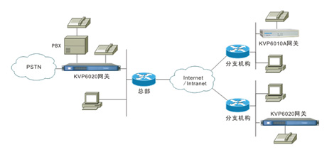 KVP6020采用模塊化設計,支持FXS、FXO、E&M、E1等多種語音模塊,最大可支持40路FXS用戶接口,可用于總部和大、中型分支機構,提供IP語音通信業(yè)務,也可通過FXO、E&M、E1等中繼接口與PBX、與PSTN相連,提供中繼匯接業(yè)務,典型應用如下圖。