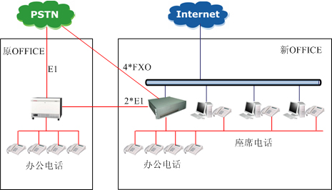 總部目前已有電話用戶交換機一臺,滿足總部所有員工的電話需要,而分部需要新建電話網(wǎng)絡,使之和總部能組網(wǎng),滿足短號互撥,不產(chǎn)生費用的要求。