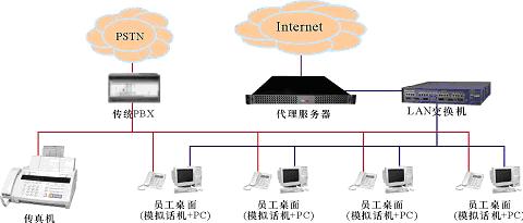 某中小企業(yè),無分支機構,現時有一個由傳統(tǒng)PBX構建的電話系統(tǒng)和一個以太局域網,兩者相互獨立,局域網通過一臺代理服務器用以太網或ADSL方式接入Internet。企業(yè)的語音通信由電話系統(tǒng)實現;員工的日常工作需要使用計算機以及多種局域網和Internet服務。