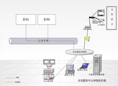 網(wǎng)絡(luò)視頻服務(wù)器對前端監(jiān)控點攝像機采集的視頻信號進行編碼壓縮處理后,通過2M專線上傳到市公安局監(jiān)控中心。