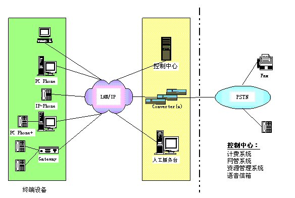 控制中心:包括資源管理系統(tǒng)、計費系統(tǒng)、網(wǎng)管系統(tǒng)、語音信箱。 其中,資源管理系統(tǒng)主要執(zhí)行地址翻譯、權(quán)限控制、路由管理等功能;計費系統(tǒng)主要完成計費及結(jié)算功能;網(wǎng)管系統(tǒng)完成對網(wǎng)絡(luò)及IP