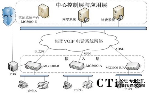 各單位利用自己的網(wǎng)絡(luò)組建集團(tuán)VOIP語(yǔ)音網(wǎng)絡(luò)。無(wú)論是在國(guó)內(nèi)的各單位總部及其分支還是海外的企業(yè)分支,不管是通過專網(wǎng)還是ADSL等連入集團(tuán)管理平臺(tái),都可以利用這個(gè)管理平臺(tái)傳輸語(yǔ)音業(yè)務(wù),總部和各分支機(jī)構(gòu)可以通過不同的網(wǎng)絡(luò)接入手段。