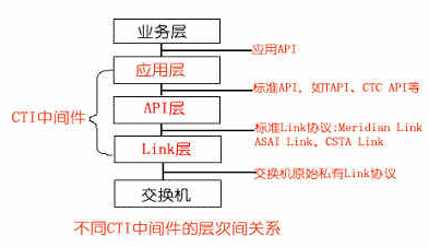 根據(jù)CTI的功能定位,可以把CTI產(chǎn)品劃分為不同的層次,一般地可分為三種類型:Link層產(chǎn)品、API層產(chǎn)品、應用層產(chǎn)品,其分層結(jié)構示意圖如下所示: