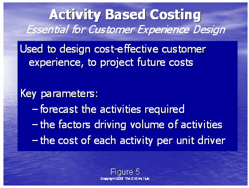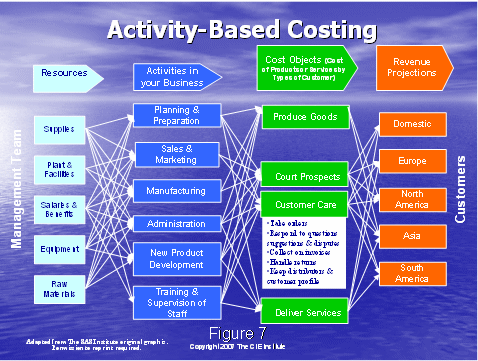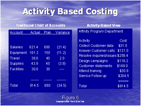 相關(guān)的是,使用傳統(tǒng)的成本和通過一種系統(tǒng)的合理的方式把該成本分配到各個(gè)行動(dòng)上去。這是它們自身的科學(xué),如果你擁有數(shù)字的頭腦,你可以確定一個(gè)計(jì)劃,該計(jì)劃把企業(yè)的成本分配到圖6右手邊所示的不同的行動(dòng)上去。這是一個(gè)關(guān)鍵的步驟。