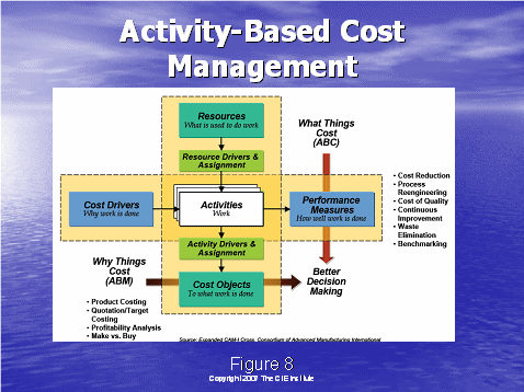 通過了解圖8,我們將以行動(dòng)成本管理大體是什么的總括作為結(jié)束。我們從左邊的成本驅(qū)動(dòng)因素開始——這是做工作的原因,例如:獲得客戶,維持客戶。就如圖4中所說的,這些成本驅(qū)動(dòng)因素可以細(xì)分到工作行動(dòng)上去。可以通過描述人,培訓(xùn),設(shè)備和技術(shù)資源來組成工作行動(dòng)。資源驅(qū)動(dòng)因素被用于分配這些企業(yè)成本到各個(gè)行動(dòng)上去。下一步就是系統(tǒng)地確定行動(dòng)驅(qū)動(dòng)因素,分配行動(dòng)成本到成本對(duì)象上去,這有利于決策的制定。例如,獲得一個(gè)客戶和維持一個(gè)客戶需要花費(fèi)多少的成本?