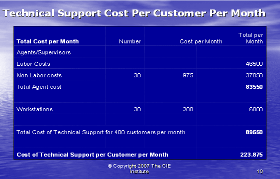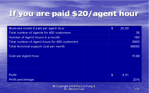 根據(jù)圖表12,我們可以算出第二種方式的利潤百分比。如果我們假設每個客戶每年的收入是20,000美元,其中分配給呼叫中心部門的收入是20%。我們每個客戶每月的收入是333.33美元,每個客戶月的成本是223.88美元(參見圖表10)。這導致我們來自每個客戶每月的利潤是109.46美元——這將產(chǎn)生33%的利潤率。