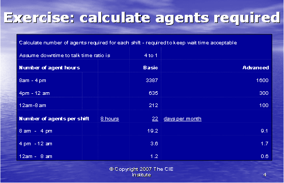 我們現(xiàn)在可以轉(zhuǎn)向下一階段的運算,這一運算決定我們需要多少座席去支持400個客戶。由于技術支持呼叫中心一天24小時,一周7天進行運營,以及座席必須三班倒工作,使問題更為復雜。通過測量一天當中的話務量,我們發(fā)現(xiàn)80%的電話聚集在上午八點到下午四點的時間段,15%的電話聚集在下午四點到午夜的時間段,還有5%則在午夜到上午八點的時間段。因此,現(xiàn)在我們用該信息去計算每個排班中所需要的通話時長。表3表明了根據(jù)基礎和高級支持需要而為我們計算出的小時數(shù)。
