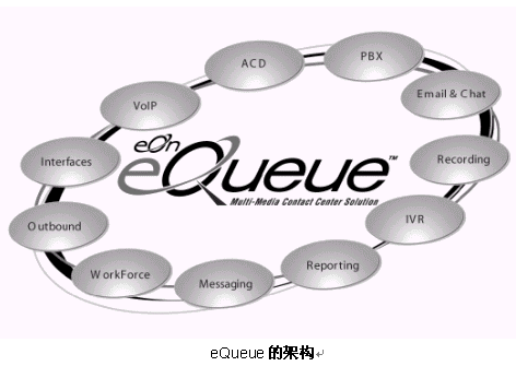 完整的eQueue解決方案包括一系列模塊化設計的功能組件,它們是:支持各種媒體類型的自動呼叫分配ACD;具有完整交換功能的PBX;基于Java技術(shù)、Web瀏覽器的Email/Chat;支持人工和自動兩種工作方式的Recording;智能化的交互式語音應答系統(tǒng)IVR;集成了上千種標準格式、支持客戶任意自定義模板的Reporting;跨越所有媒體類型的、統(tǒng)一信息傳遞Messaging;幫助聯(lián)絡中心降低經(jīng)營管理成本、提高座席員勞動效率的WorkForce;擁有呼叫過程智能分析能力的預撥號系統(tǒng)Outbound