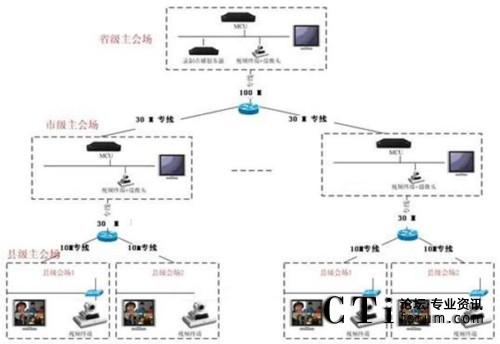 本方案整體采用基于IP網(wǎng)絡(luò),在省、市中心機(jī)房放置MCU,通過網(wǎng)線接入核心交換網(wǎng)絡(luò);在會議室放置視頻終端,通過郵政專網(wǎng)進(jìn)行互聯(lián)。一級系統(tǒng)以省中心會議室為主會場,下屬各市會議室為分會場組成邏輯星形拓?fù)浣Y(jié)構(gòu);二級系統(tǒng)以市州郵政局會議室為主會場,下屬各區(qū)縣郵政局會議室為分會場。兩級系統(tǒng)通過MCU級聯(lián)互通,形成一個樹形的拓?fù)浣Y(jié)構(gòu)。系統(tǒng)主要由全視頻會議管理系統(tǒng)、純硬件MCU、純硬件1080P高清會議終端等組成,采用MCU為中心的星形結(jié)構(gòu)建立一個數(shù)字連接的、專業(yè)的視頻會議系統(tǒng)。視頻會議系統(tǒng)可由省郵政廳視頻會議中心控制,任意切換參會市、州(分中心)、縣、市、區(qū)(終端)的會議畫面。視頻會議系統(tǒng)可以指定任意參會單位發(fā)言并實(shí)現(xiàn)全省會場統(tǒng)一的畫面切換。視頻會議系統(tǒng)可實(shí)現(xiàn)省郵政局集中控制與管理,易于使用,能進(jìn)行遠(yuǎn)程管理、遠(yuǎn)程維護(hù)、可降低維護(hù)成本。通過授權(quán),各級單位可自行組織、控制會議,方便各級單位的使用。