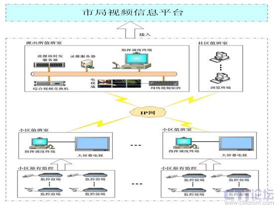 視頻聯(lián)防聯(lián)動系統(tǒng)由派出所指揮調(diào)度室、社區(qū)值班室、小區(qū)值班室和小區(qū)前端監(jiān)控等部分組成,其中小區(qū)部署指揮調(diào)度終端,可負責本小區(qū)即周邊的監(jiān)控管理;社區(qū)值班室部署視頻瀏覽端,可以實時監(jiān)看管轄區(qū)域的視頻圖像;派出所部署綜合視頻交換機、流媒體轉(zhuǎn)發(fā)服務器、網(wǎng)絡視頻矩陣、錄像服務器、指揮調(diào)度終端,可以監(jiān)控管理管轄區(qū)內(nèi)所有視頻圖像,并可接入到市局視頻信息平臺,實現(xiàn)與3111工程的接入。派出所、社區(qū)、小區(qū)多方可實現(xiàn)社區(qū)治安視頻聯(lián)防聯(lián)動,系統(tǒng)結(jié)構(gòu)圖如下所示: