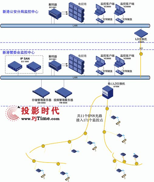 除了攝像頭與圖像顯示設(shè)備之外,整個(gè)監(jiān)控系統(tǒng)主要采用的都是H3C設(shè)備。系統(tǒng)用11(應(yīng)改成10條,最終只用了10條)條EPON光路接入全部171個(gè)監(jiān)控?cái)z像頭;并采用專業(yè)的EX1000存儲(chǔ)產(chǎn)品為120T關(guān)鍵歷史視頻數(shù)據(jù)的提供了高可靠性的存儲(chǔ)保護(hù);而S7506、S3600交換機(jī)優(yōu)化的組播特性和特色的雙流技術(shù)則確保了所有監(jiān)控點(diǎn)的高清晰、高實(shí)時(shí)性、支持大量并發(fā)訪問。系統(tǒng)的集中管理、批量配置、全網(wǎng)網(wǎng)管也可以為新港開發(fā)區(qū)節(jié)省管理成本。