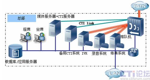 北京為總部中心,將部署CTI服務(wù)器、IVR服務(wù)器、錄音系統(tǒng)、傳真系統(tǒng)、文件服務(wù)器及相關(guān)業(yè)務(wù)數(shù)據(jù)庫服務(wù)器,為各個(gè)營業(yè)網(wǎng)點(diǎn)提供業(yè)務(wù)支撐?偛繉(duì)整個(gè)網(wǎng)絡(luò)進(jìn)行管理,包括平臺(tái)配置、業(yè)務(wù)管理、數(shù)據(jù)管理、人員調(diào)度等。在總部CTI系統(tǒng)我們采用主備模式,確保了在出現(xiàn)網(wǎng)絡(luò)故障主CTI系統(tǒng)無法提供服務(wù)情況下,備用CTI系統(tǒng)將接替主CTI系統(tǒng)工作,確保了整個(gè)系統(tǒng)的正常工作。硬件平臺(tái)方面,UAP我們采用了雙主控板雙電源供電工作模式,這對(duì)系統(tǒng)長期穩(wěn)定工作提供了保障?偛客瑫r(shí)也部署北京農(nóng)村商業(yè)銀行300個(gè)坐席人員,這些坐席人員可以按照業(yè)務(wù)進(jìn)行區(qū)分,大部分坐席精通一般的業(yè)務(wù),為普通客戶提供優(yōu)質(zhì)服務(wù),少部分坐席(專業(yè)坐席)人員為高價(jià)值客戶提供高級(jí)的專業(yè)的優(yōu)質(zhì)服務(wù),在普通坐席比較忙時(shí),專業(yè)坐席可以為普通用戶提供服務(wù),坐席中,還有極少部分可以充當(dāng)坐席管理員角色,他們也可以監(jiān)控各個(gè)分中心坐席服務(wù)的質(zhì)量,對(duì)有問題服務(wù)可以實(shí)現(xiàn)監(jiān)聽、監(jiān)察、和強(qiáng)拆功能,及時(shí)的保證服務(wù)質(zhì)量,維護(hù)了企業(yè)形象。