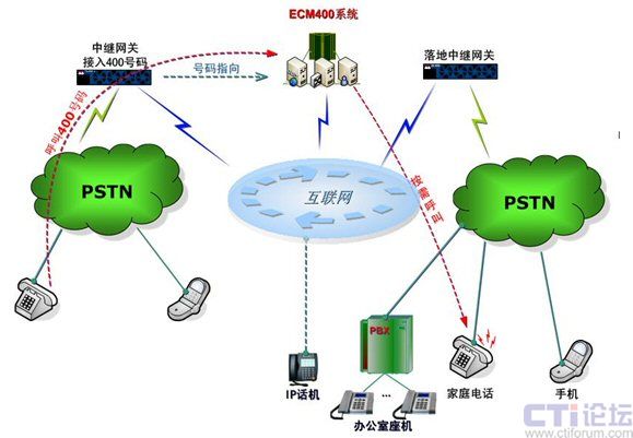 申請到400號(hào)碼的服務(wù)商,通過TG中繼網(wǎng)關(guān),把400號(hào)指向ECM400系統(tǒng),從而在IP網(wǎng)和PSTN網(wǎng)上建立了一個(gè)完美的過渡橋梁,對(duì)不同的通訊方式進(jìn)行了有效融合,能充分整合雙網(wǎng)的各種資源和功能,從而達(dá)到為企業(yè)提供更多、更好服務(wù)的目的。