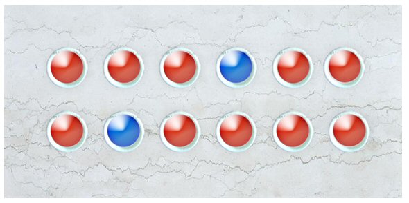 某一個(gè)呼叫中心,在它廁所上頭,裝了這樣一個(gè)裝置。這裝置如下面的圖所示,有12個(gè)燈號,燈號有兩種顏色,一種是紅色,一種是藍(lán)色,有時(shí)會變成紅色,有時(shí)又會變成藍(lán)色。