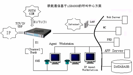 相對于現(xiàn)在的兩種主流呼叫中心方案,毅航通信基于iSX4000呼叫中心解決方案直接整合了Internet的接入。傳統(tǒng)由IVR完成的操作也可以通過Web頁面上的流程實現(xiàn),這樣用戶通過下拉菜單、簡單填寫、點擊按鈕等操作完成客戶識別、業(yè)務識別等操作,這些流程完成后,通過VoIP對呼叫中心呼入,由呼叫中心對呼入進行受理,再按照相應的原則分配到座席,座席再作相應的應答和處理,從而為客戶提供了一個通過Web站點直接進入呼叫中心的途徑,把Internet所具有的豐富信息資源和強大的功能賦予呼叫中心,它向客戶提供一個可訪問的Web站點,使得呼叫中心從“撥叫到交談(Dial to Talk)”發(fā)展到“點擊到交談(Click to Talk)”,通過Internet可以提供IP電話語音呼叫、Call Back、IP傳真、IM、E-mail等功能,擴展了通信渠道,一方面用戶可以實現(xiàn)免費接入到呼叫中心,另一方面企業(yè)能夠向更多的客戶提供優(yōu)質(zhì)、方便的服務資源,而且由于這些資源的價格相對傳統(tǒng)通信便宜,使企業(yè)為客戶提供全國、乃至于全球服務成為可能,提高了企業(yè)客戶服務水平,增強了企業(yè)競爭力。毅航通信統(tǒng)一呼叫中心解決方案系統(tǒng)結構如圖所示: