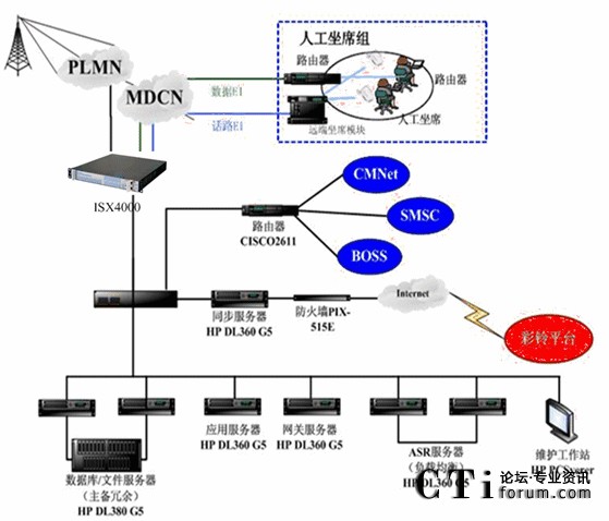 平臺(tái)核心話(huà)路接入集在中毅航通信iSX4000智能業(yè)務(wù)交換機(jī)的IVR自動(dòng)語(yǔ)音平臺(tái),人工坐席平臺(tái)通過(guò)和系統(tǒng)支撐軟件實(shí)現(xiàn)遠(yuǎn)端坐席功能,通過(guò)專(zhuān)線(xiàn)中繼與IVR平臺(tái)實(shí)現(xiàn)話(huà)路連接;InterNet與IVR平臺(tái)實(shí)現(xiàn)數(shù)據(jù)同步。根據(jù)移動(dòng)交換網(wǎng)傳輸內(nèi)容選擇應(yīng)相的IVR自動(dòng)語(yǔ)音服務(wù)或人工坐席服務(wù)。