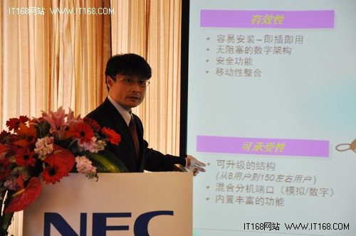 2011年3月28日,國(guó)際通信行業(yè)巨頭日本電氣株式會(huì)社(以下簡(jiǎn)稱(chēng)NEC公司)在北京舉辦新品發(fā)布會(huì),宣布最新智能通訊服務(wù)器SL1000正式上市。發(fā)布會(huì)上,NEC公司IT網(wǎng)絡(luò)國(guó)際解決方案組平臺(tái)事業(yè)部副總裁橋沢太一郎先生闡述了對(duì)未來(lái)中國(guó)市場(chǎng)的市場(chǎng)策略和遠(yuǎn)景目標(biāo)。