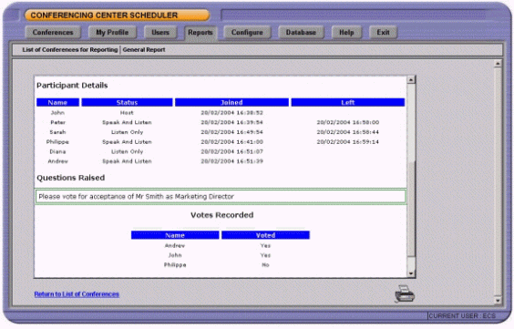 管理員可以生成會議使用率和每個會議的報告。消息內容包括會議名稱,ID號,會議起始日期,會議持續(xù)時間和與會人員的數目。每個會議報告可以列出與會人員的詳細列表和他們何時進入/離開會議。
