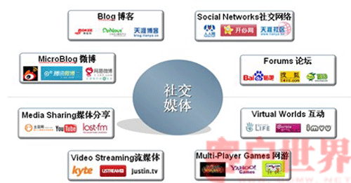 在國外這些網(wǎng)絡(luò)新媒體包括: SNS社交網(wǎng)絡(luò)(如FACEBOOK)、BLOGS博客、WIKI維基(WIKIEPEDIA\WIKITRAVEL、內(nèi)容分享(如圖片分享FLICKR\視頻分享YOUTUBE\社會(huì)標(biāo)簽DEL)、社區(qū)(包括傳統(tǒng)的BBS社區(qū)和新興的3D社區(qū)如第二人生等)和微博(如TWITTER)等。在國內(nèi)也涌現(xiàn)了一批社交媒體,如新浪、騰訊微博,天涯社區(qū)、開心網(wǎng)等。