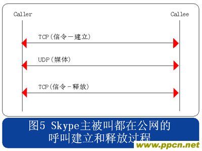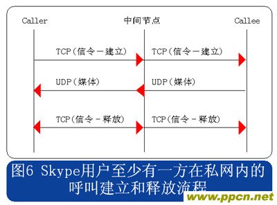 從上述流程圖可見,Skype的呼叫信令都采用TCP封裝,而媒體流則使用UDP封裝,當有任何一方用戶位于限制UDP包的防火墻內(nèi)時,媒體流就會采用TCP封裝。另外當Skype用戶至少有一方位于私網(wǎng)內(nèi)時,所有的信令和媒體消息都經(jīng)過一個或多個中間節(jié)點轉發(fā)。此時無需擔心用戶通話的媒體流因為經(jīng)過中間節(jié)點轉發(fā)而被竊聽,因為Skype采用了對消息進行端到端加密的機制。
