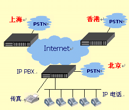 通過網(wǎng)絡電話終端IAD的內(nèi)線口(PHONE),連接當?shù)剞k公電話環(huán)境(程控交換機\電信虛擬網(wǎng)\電話機),實現(xiàn)內(nèi)部電話通過互聯(lián)網(wǎng)通信。通過外線口(LINE)連接PSTN市話網(wǎng),實現(xiàn)注冊的外部移動電話\市話呼入,客戶服務電話的呼入,各地區(qū)間的長途電話的"落地"。