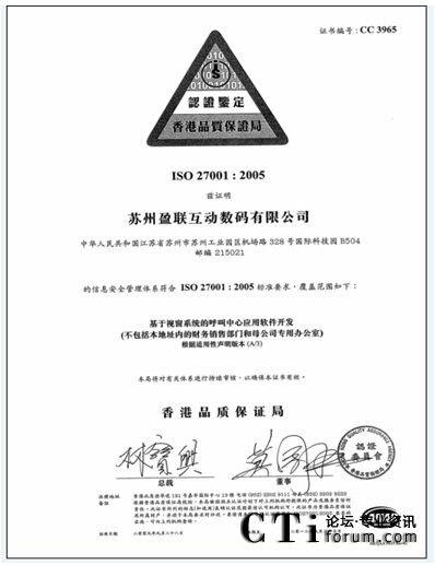 2009年9月28日,蘇州盈聯(lián)公司獲得了由國際權(quán)威認(rèn)證機(jī)構(gòu)香港品質(zhì)保證局頒發(fā)的ISO 27001:2005(信息安全管理體系ISMS)國際認(rèn)證證書,這標(biāo)志著蘇州盈聯(lián)公司繼2008年7月通過CMMI3級(jí)評(píng)估之后又一見證企業(yè)資質(zhì)與能力的重要里程碑。