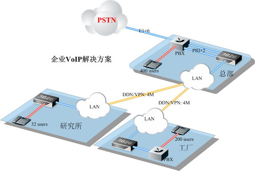 而目前網(wǎng)絡(luò)環(huán)境的改善,ADSL、寬帶的接入方式越來越普及,許多企業(yè)以及他們的分支機(jī)構(gòu)已經(jīng)通過各種方式接入Internet,鑒于Internet便宜的使用費(fèi)用,廣泛的普及范圍,基于VPN/DDN的VOIP解決方案,徹底解決了上述問題,彌補(bǔ)了傳統(tǒng)電話網(wǎng)關(guān)的不足,且用戶可以根據(jù)自己需要,不斷擴(kuò)展IP語音端口,"邊發(fā)展邊升級(jí)",經(jīng)濟(jì)靈活,是一套性價(jià)比非常高的方案。