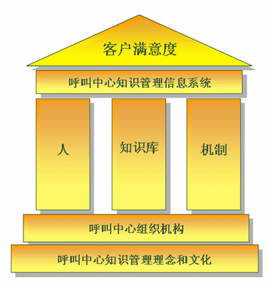 如上圖呼叫中心知識管理大廈。其是建立在呼叫中心知識管理理念文化、組織機構(gòu)基礎上,以人、知識庫、機制為核心,通過呼叫中心知識管理信息系統(tǒng)承載實施,以提高客戶滿意度為目的的綜合系統(tǒng)。