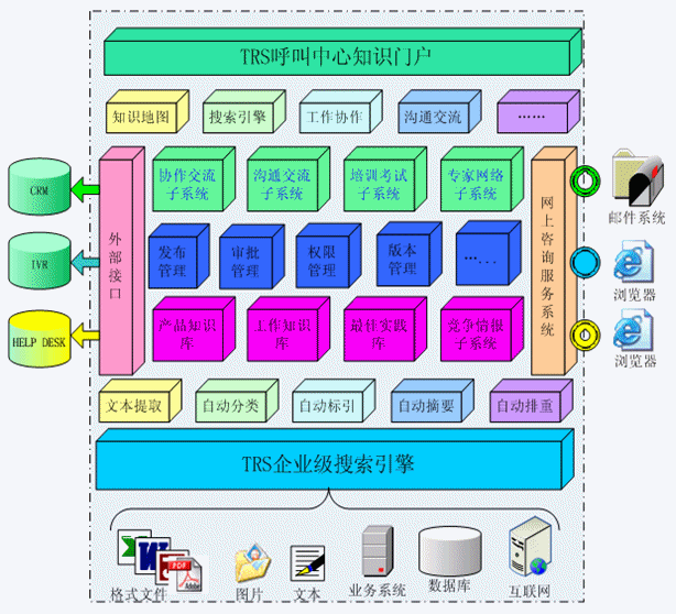 TRS Call Center 知識管理系統(tǒng)構(gòu)建在TRS企業(yè)級搜索引擎之上,融合了TRS文本挖掘技術和內(nèi)容管理技術,全面包括知識庫、競爭情報、專家網(wǎng)絡、培訓考試、溝通交流和協(xié)作交流六大子系統(tǒng),以及發(fā)布管理、審批管理、權限管理、版本控制等系統(tǒng)管理模塊;并集成面向用戶的網(wǎng)上咨詢服務系統(tǒng),提供面向客戶管理信息系統(tǒng)(CRM)、自動語音應答系統(tǒng)(IVR)、Help