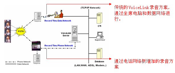 Voicelink 監(jiān)控錄音方案完全適應(yīng)現(xiàn)代呼叫中心的環(huán)境。Voicelink能有效的節(jié)約成本,它不需要專用硬件,能有效的利用包括座席計算機和網(wǎng)絡(luò)等公司的現(xiàn)有資源來進行日常電話錄音。但考慮到有些呼叫環(huán)境只有涉及到電話呼入和呼出,也不用跟業(yè)務(wù)應(yīng)用或后臺數(shù)據(jù)(如證券交易平臺)交互,現(xiàn)在,Voicelink增加了錄音方式來提高解決方案的能力,該錄音方式是通過電話網(wǎng)絡(luò)來錄音的,該新增加的錄音方式完全獨立于計算機和數(shù)據(jù)網(wǎng)絡(luò)。下圖顯示Voicelink提供不同的方式,形成一個單一的錄音平臺。