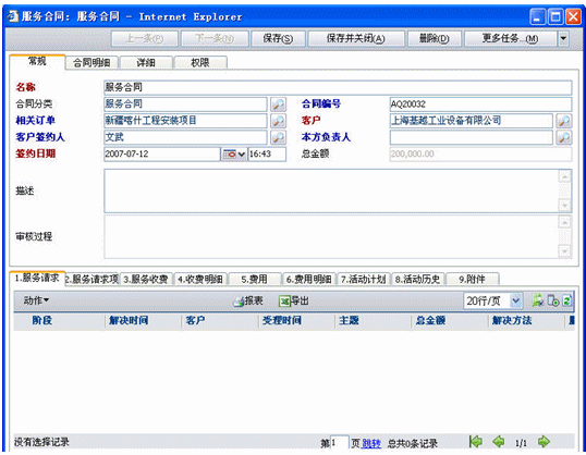 服務合同是也分為兩種,一種是非公司項目的服務請求此時沒有與訂單關聯(lián);二種是公司項目后服務請求,此時可以關聯(lián)訂單也可以不關聯(lián)訂單,如果關聯(lián)訂單就可以將訂單產品明細導入合同明細中(導入明細是可以調整數量和價格的).