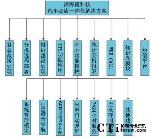 針對(duì)目前國內(nèi)汽車4S店的服務(wù)現(xiàn)狀,并結(jié)合4S店需求的獨(dú)特特點(diǎn),專為國內(nèi)汽車4S店量身打造的深海捷汽車4S店聯(lián)絡(luò)中心系統(tǒng),除具備呼叫中心基本功能外,還集成了分機(jī)遠(yuǎn)程部署、TTS功能、緊急救援處理模塊、投訴/建議受理模塊、WEB CALL模塊和短信平臺(tái)模塊等特色功能?傮w功能結(jié)構(gòu)圖如下: