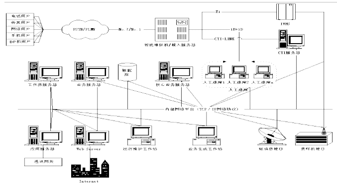 客戶服務(wù)中心系統(tǒng)包含智能排隊機(jī)(含接入服務(wù)器)、核心服務(wù)器CCS、交互式語音應(yīng)答系統(tǒng)IVR、語音傳真服務(wù)器、業(yè)務(wù)服務(wù)器、工作流服務(wù)器、數(shù)據(jù)庫服務(wù)器、Internet/Intranet服務(wù)器、人工座席、尋呼機(jī)接口,手機(jī)短消息接口等組成。如下圖所示為Runsun呼叫中心系統(tǒng)結(jié)構(gòu)圖: