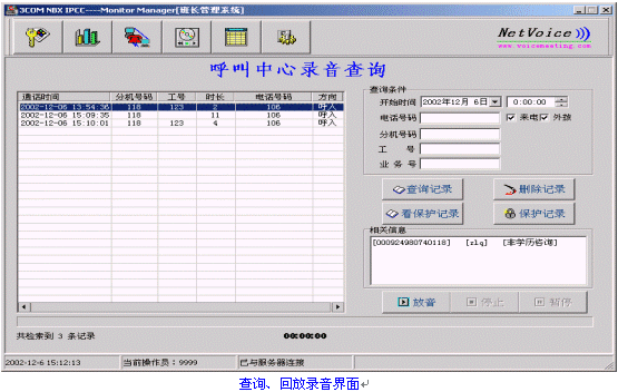 NetVoice作為3Com NBX網(wǎng)絡(luò)電話產(chǎn)品中國(guó)區(qū)總分銷,在積累大量3Com IPCC開發(fā)應(yīng)用經(jīng)驗(yàn)的基礎(chǔ)上,通過對(duì)3Com NBX產(chǎn)品技術(shù)特性的詳盡分析,并結(jié)合其它錄音產(chǎn)品的成功開發(fā)經(jīng)驗(yàn),成功的在3Com NBX產(chǎn)品上開發(fā)出一套針對(duì)3Com IP Call center坐席的功能先進(jìn)的純軟件實(shí)現(xiàn)高性能錄音系統(tǒng)(NV-REC)。