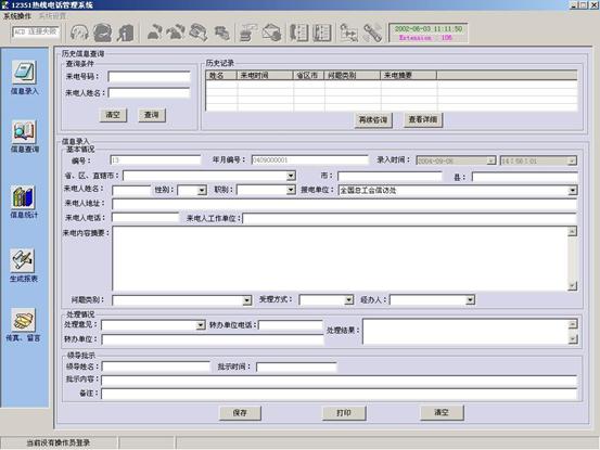 - 完善業(yè)務(wù)統(tǒng)計工作:針對健康熱線采集的信息,我們根據(jù)實際需要設(shè)計了統(tǒng)一格式的各項報表,同時將報表全部做電子化處理,方便業(yè)務(wù)數(shù)據(jù)的統(tǒng)計及管理,為各級領(lǐng)導(dǎo)決策提供可靠依據(jù)。