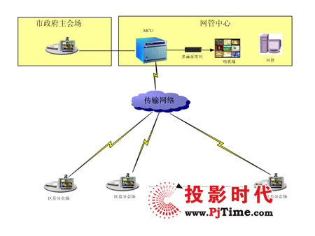 傳輸網(wǎng)絡(luò)采用4M專線,整個系統(tǒng)由控制中心、市政府主會場和18個區(qū)縣分會場組成,在控制中心配置MCU、網(wǎng)管和電視墻多畫面顯示單元,通過網(wǎng)管對系統(tǒng)實行設(shè)備的統(tǒng)一管理和會議資源的統(tǒng)一調(diào)度,控制中心配置18路電視墻集中顯示單元,通過電視墻,可實時監(jiān)看18個區(qū)縣分會場情況。在市政府主會場和18個區(qū)縣分會場,各會場配置1套高清晰視頻會議終端,各會場終端4M專線接入控制中心,實現(xiàn)全市電子政府的視頻會議系統(tǒng)。系統(tǒng)建設(shè)完成后,可實現(xiàn)導(dǎo)演控制、主席控制、點名發(fā)言、會場輪巡、攝像機遠控、電視墻、多畫面、多方混音等視頻會議系統(tǒng)功能。