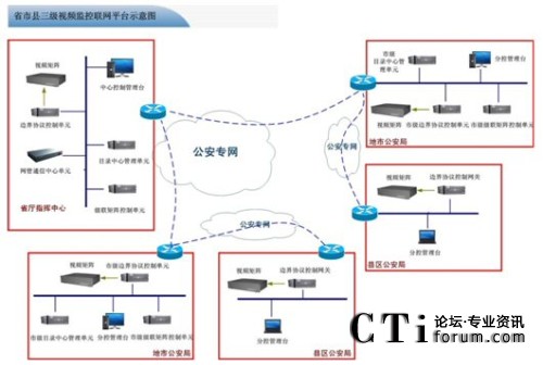 在省廳到地市之間配置視頻監(jiān)控聯(lián)網(wǎng)平臺(tái)中的核心管理調(diào)度單元、專(zhuān)用視頻終端、CS中心GIS控制客戶(hù)終端、邊界標(biāo)準(zhǔn)協(xié)議控制單元,地市核心管理調(diào)度單元、級(jí)聯(lián)矩陣控制中心單元、網(wǎng)管通信中心單元、中心音頻ACU調(diào)度單元、邊界標(biāo)準(zhǔn)協(xié)議控制網(wǎng)關(guān)、CS中心GIS控制客戶(hù)終端、通用型數(shù)字矩陣解碼陣列、通用標(biāo)準(zhǔn)控制矩陣鍵盤(pán)等組件構(gòu)建省至地市級(jí)公安監(jiān)控聯(lián)網(wǎng)系統(tǒng)。