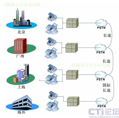 各分支機(jī)構(gòu)租用獨(dú)立的電話號碼并接入當(dāng)?shù)豍STN,在這種架構(gòu)下,各地之間通話就會(huì)產(chǎn)生長途費(fèi)用,并占用電話線路,但如果使用IP
