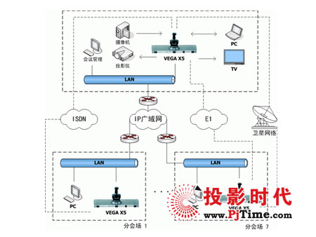 如圖所示,主會場配置1臺愛斯樂VegaX5終端,X5最高帶寬可達4Mbps。內置8點混網(IP&ISDN) MCU。在每個分會場采用1臺愛斯樂VEGA X3終端。各會場根據(jù)網絡情況,可以采用不同的網絡接入方式。VEGA X5可以支持寬帶IP、ISDN、專線接入等。且X5的內置MCU在召開多點會議時可以做雙視頻流傳送,可以同時看到多會場的圖像,聲音也是全部混合的。