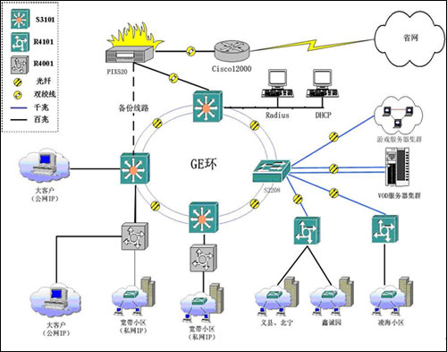 此城域網(wǎng)結(jié)構(gòu)清晰,由核心層的三層交換機只負責(zé)數(shù)據(jù)的快速轉(zhuǎn)發(fā),對業(yè)務(wù)匯聚和用戶的認證控制任務(wù)全部由接入服務(wù)器R4000來完成。要求接入服務(wù)器支持多種認證手段、加強對各類用戶實現(xiàn)不同級別的控制、為用戶的訪問提供安全保障措施、結(jié)合Radius系統(tǒng)提供多種計費功能。