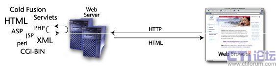 在互聯(lián)網(wǎng)上,瀏覽器通過(guò)Internet協(xié)議――比如HTTP――向Web服務(wù)器發(fā)出請(qǐng)求,而Web服務(wù)器上存放著靜態(tài)頁(yè)面和動(dòng)態(tài)應(yīng)用,它們將把HTML返回給瀏覽器,最終結(jié)果在瀏覽器中展現(xiàn)出來(lái)。如下圖所示:
