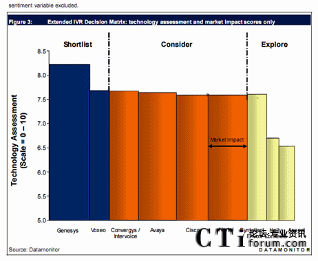 的IVR供應(yīng)商里有幸成為最優(yōu)秀的兩家供應(yīng)商之一。這個(gè)簡(jiǎn)表包含在Datamonitor 的新聞和發(fā)布的報(bào)告里面!盀槠髽I(yè)選擇一家IVR平臺(tái)供應(yīng)商”,針對(duì)IVR供應(yīng)方市場(chǎng)有詳細(xì)的分析,兩家公司分別是Voxeo和Genesys,Datamonitor