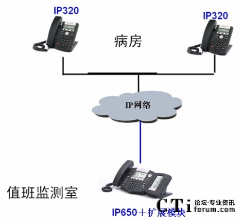 病房的IP550話機(jī)可以設(shè)置成摘機(jī)直通值班室的熱線模式,病房只要拿起聽(tīng)筒,電話自動(dòng)接通值班室,無(wú)需撥號(hào)。如果需要,病房同樣也可將IP550上設(shè)置成一鍵通話模式,定義值班室的快速通話按鍵,出現(xiàn)問(wèn)題時(shí)一鍵接通值班室。