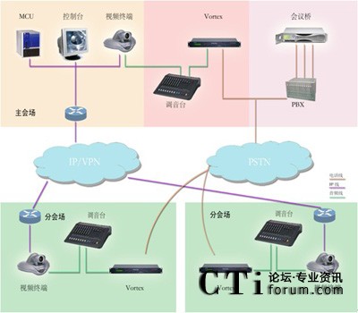 系統(tǒng)基于PSTN電話網(wǎng)絡, 在視頻會議系統(tǒng)中心會場配備一套POLYCOM VORTEX EF2241與會場調音臺聯(lián)結,并根據(jù)會場數(shù)量配備一套相應方數(shù)的音頻會議橋,各分會場分別配備一套POLYCOM VORTEX EF2211與會場調音臺聯(lián)結,如用戶無線路條件,也可使用當?shù)剡\營商的電話會議平臺。